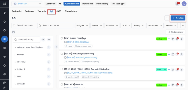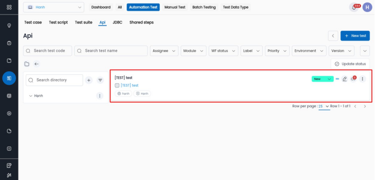 Bước 1: Trên màn hình thư viện API test, click “New test”