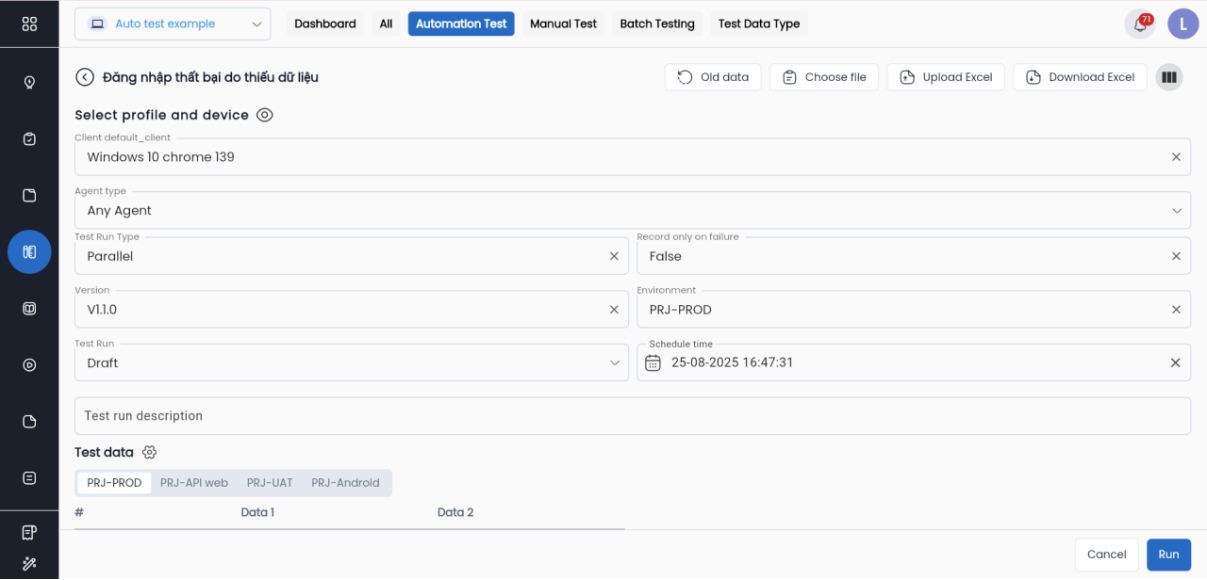 Mỗi khi Run, hệ thống lấy data mới nhất của test case và hiển thị trên màn hình test run, do đó người dùng không thể chỉnh sửa data ở đây. Để update/ select data của test case, người dùng truy cập vào tab Data của test case bằng cách click vào icon “Config of test case”.