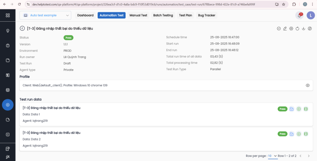 Run test case ghi nhận kết quả thực thi của trường hợp kiểm thử, giúp hệ thống có thể tổng hợp chính xác kết quả cho từng module/ version/ environment trong mỗi giai đoạn phát triển phần mềm.
