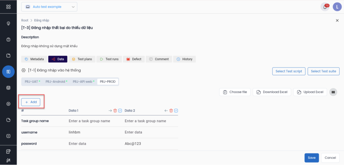 - Lựa chọn Environment, hệ thống sẽ lựa chọn luôn data của môi trường đó để thực thi kiểm thử nên trước khi Run cần nhập đầy đủ data cho từng môi trường trong tab Data của test case