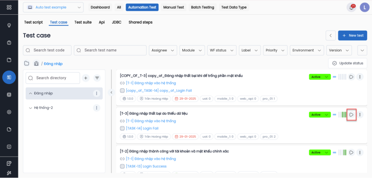 Bước 1: Trên màn hình Test Management, tab Automation Test, chọn Test case, tìm test case cần thực thi.