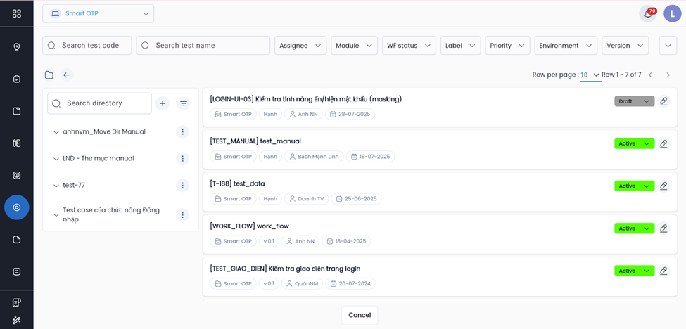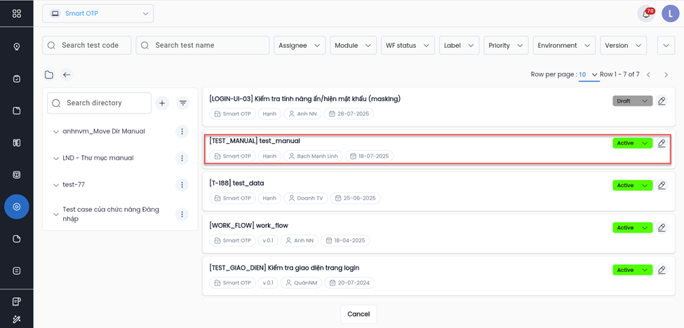 Người dùng click vào test case mong muốn với điều kiện test case đã ở trạng thái Active.