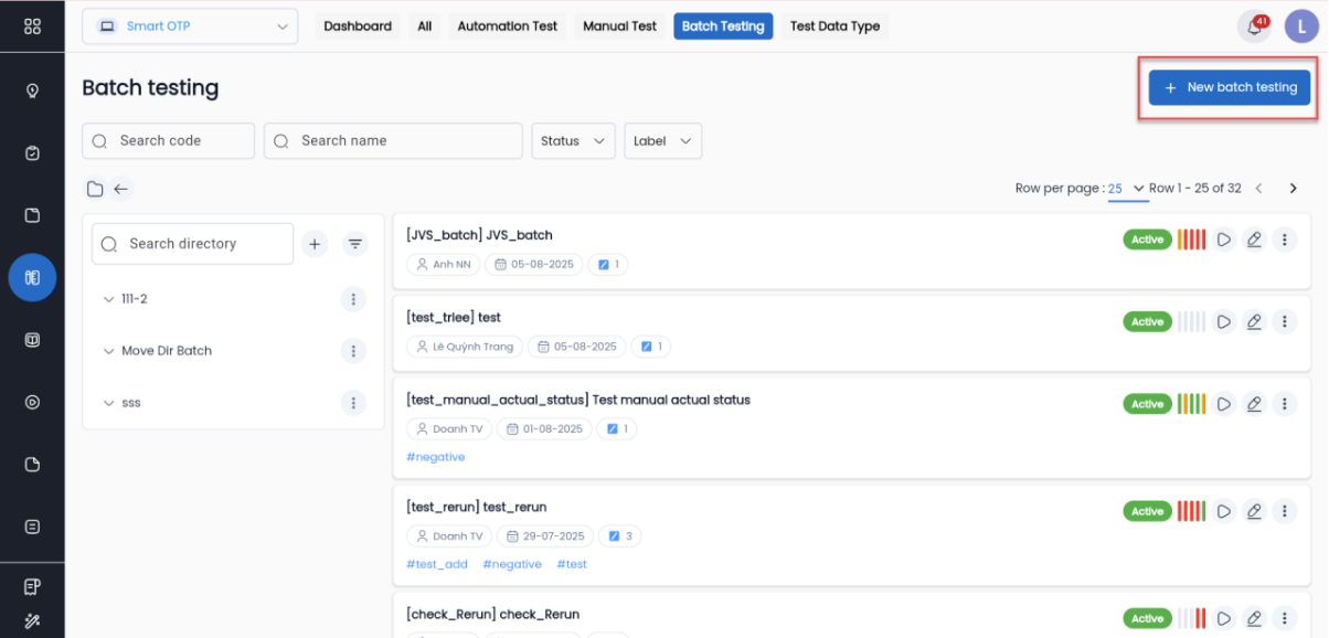 Việc tạo batch cho version mới có thể thực hiện từ chức năng New batch testing và thực hiện add batch steps cho batch như bình thường.