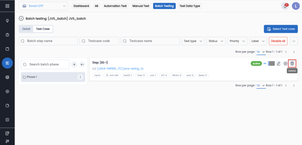 Trên màn hình batch steps của batch vừa được duplicate, thực hiện lọc tìm những test case đã được gắn nhãn Remove khỏi version và click Delete để loại bỏ test case không còn phù hợp.