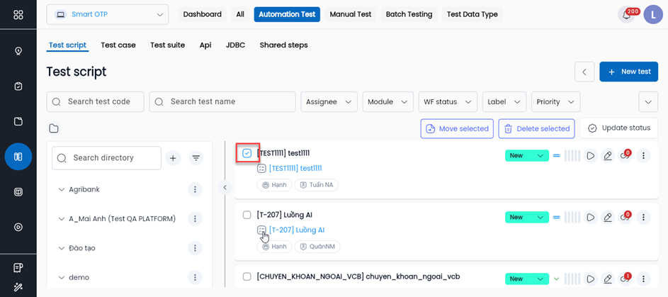 Bước 1:             Tại màn hình thư viện các kịch bản kiểm thử, chọn Test Case bạn muốn xóa
