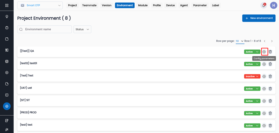 Bước 1: Trên màn hình tab Environment nhấn vào biểu tượng Config parameter ở bên phải bản ghi môi trường cần cấu hình giá trị tham số.