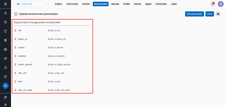 Bước 2: Hệ thống hiển thị danh sách các tham số môi trường đã tạo trước đó. Người dùng nhập giá trị theo nhu cầu mong muốn