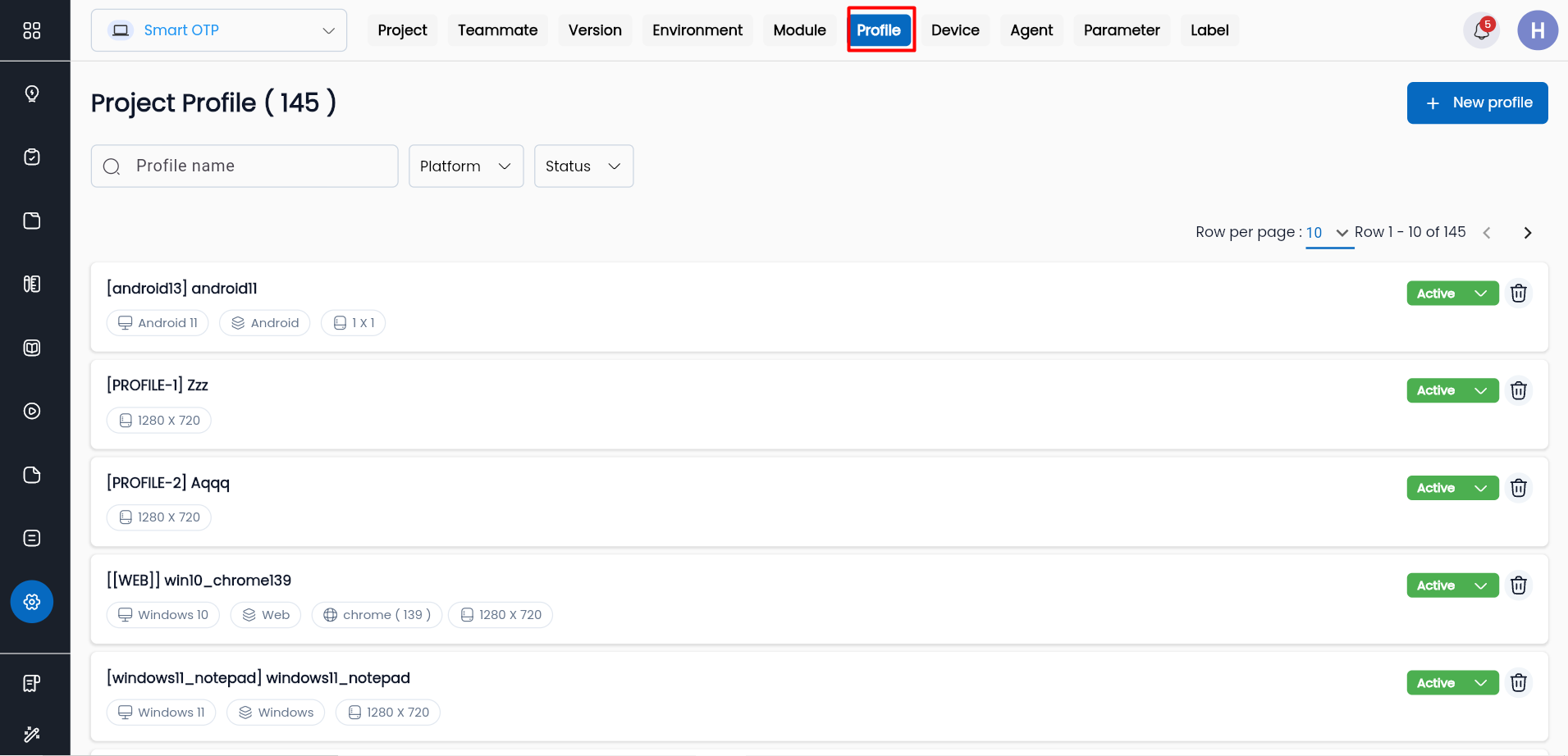 Trên màn hình tab Profile, hệ thống hiển thị danh sách các profile của dự án.