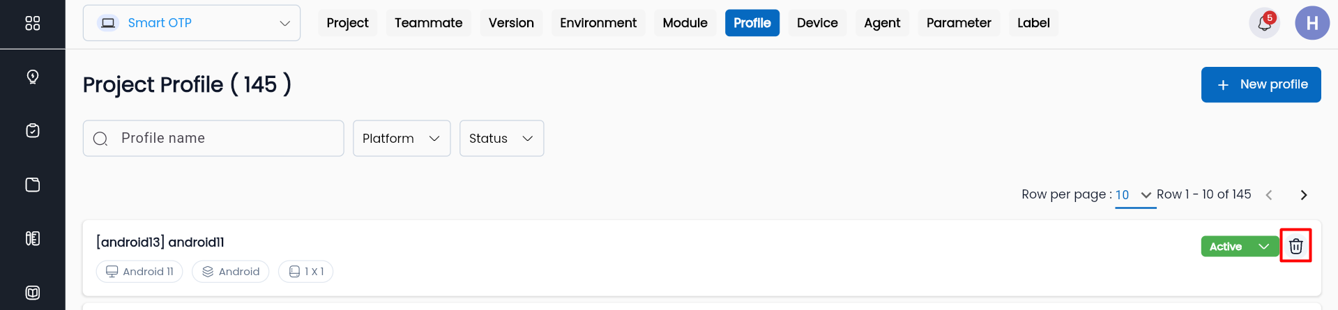 Để xóa 1 Profile trong Centralize Automation Testing Suite, thực hiện như sau:
