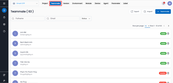 Trên màn hình tab Teammate hệ thống hiển thị danh sách các thành viên tham gia dự án.