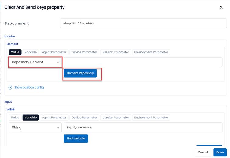 1. Tại khối Locator, chọn kiểu dữ liệu Repository Element, hệ thống hiển thị button Element Repository.
