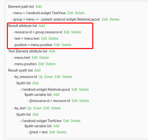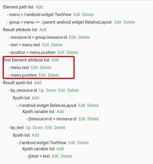 Định nghĩa các thuộc tính sẽ được hiển thị ra cho người dùng thấy khi hệ thống tìm thấy element (ví dụ: hiển thị vị trí position, hiển thị text, id...).