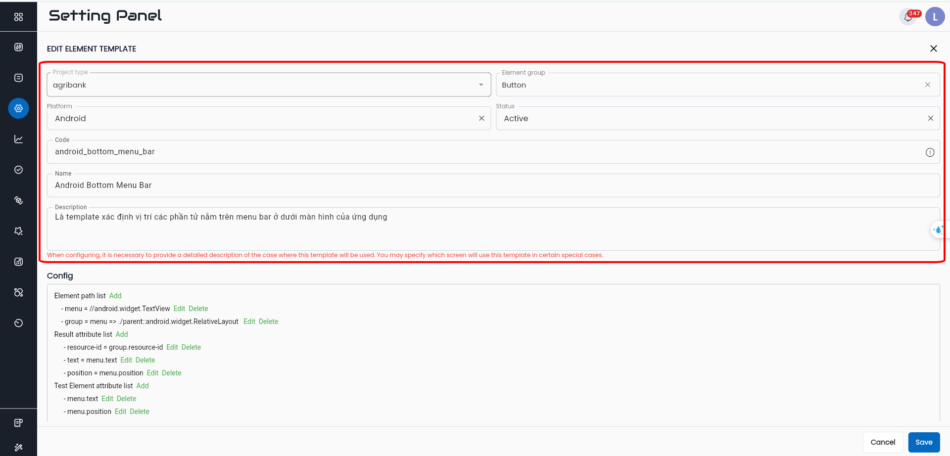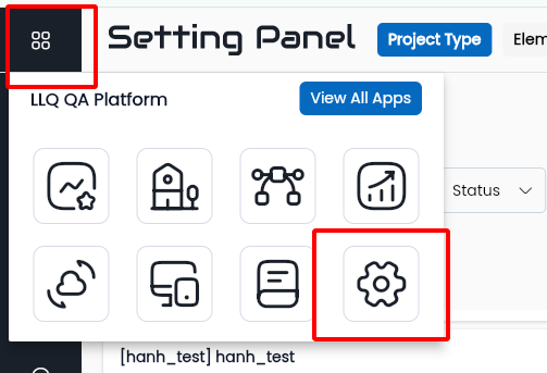 Dựa trên tài liệu hướng dẫn, cấu trúc của một Element Template trong LLQ QA Platform được chia thành hai phần chính: Thông tin chung (Metadata) và Cấu hình công thức (Config). Trong đó, phần Config là cốt lõi để hệ thống tự động nhận diện và tạo XPath. Nhấn Apps chọn Setting