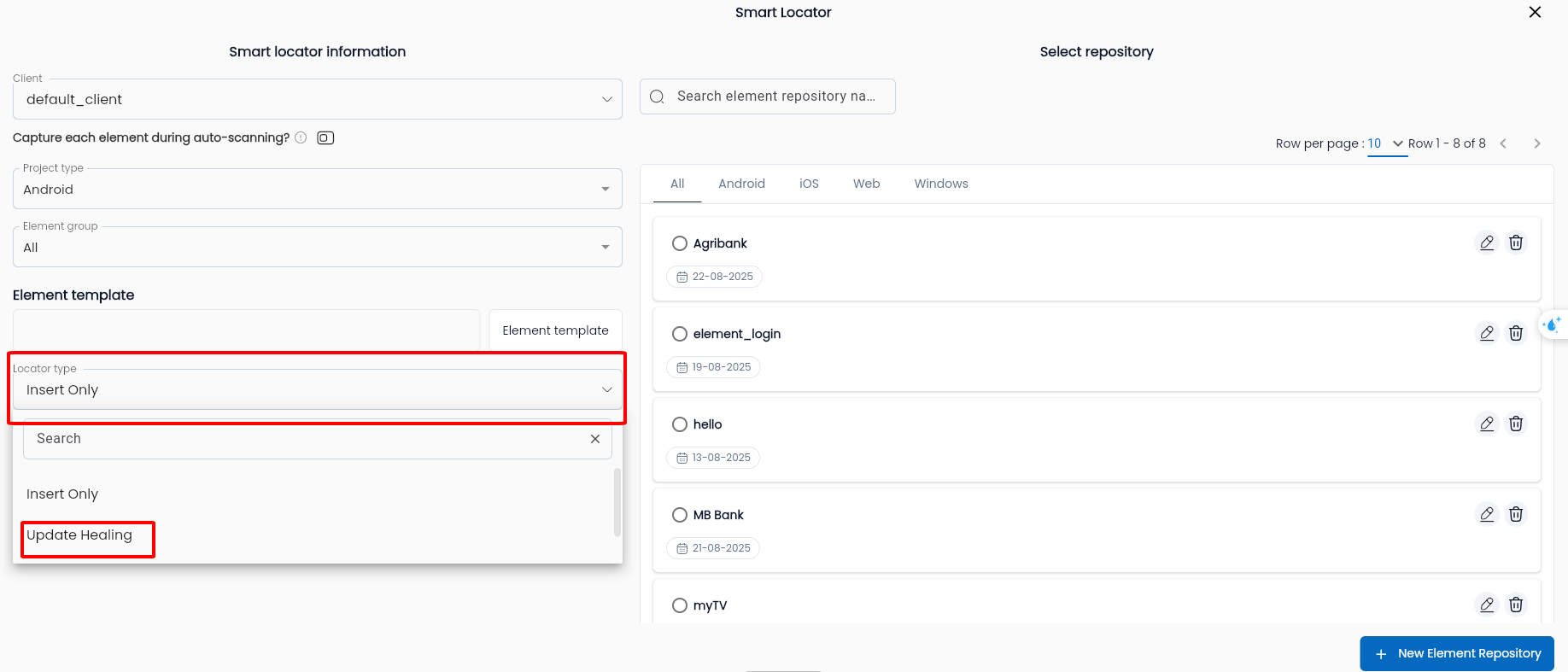 Cơ chế: Tại trường Locator type trong màn hình Smart Locator, hãy chọn Insert Update Healing (hoặc Update Healing).